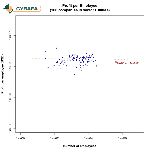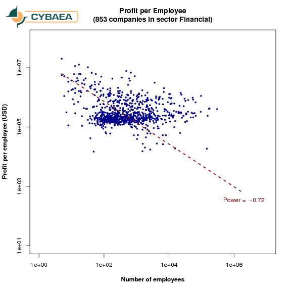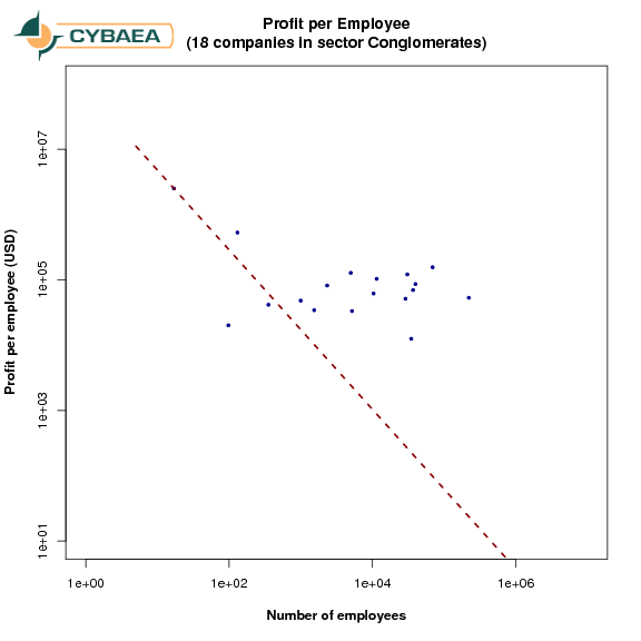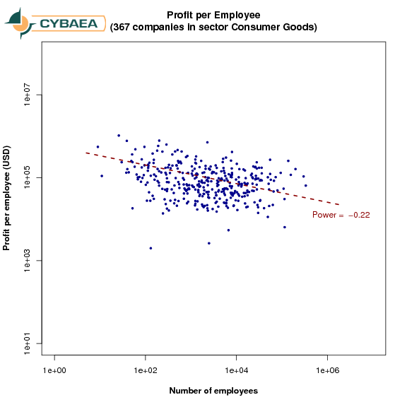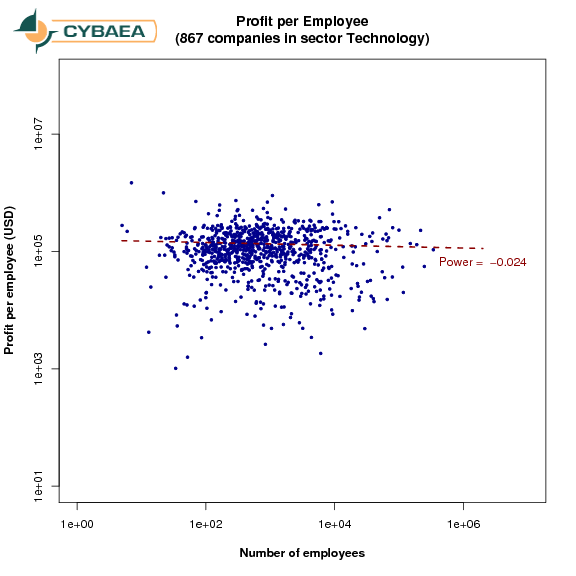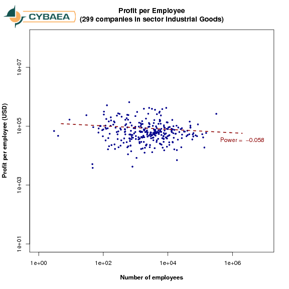 As before, we chose profits per employee as our metric for employee productivity and show it against the number of employees.