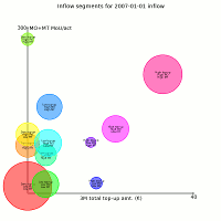 We can track the inflow segments over time. The slightly annoying animation in the margin shows 15 months of inflow segments. Here the size of the bubble is the number of customers acquired, and we have projected the segments to two dimensions: a spend metric along the abscissa and a usage metric along the ordinate. (Yes, that really is a whole lot of customers at zero spend which may be the subject of another article.)