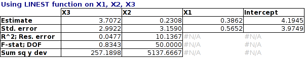 F-statistic: 0.8343 on 3 and 50 DF, p-value: 0.4814Everybody likes to pick on Excel, so let us load the data into version 3.3.2 of LibreOffice, the free Open Source personal productivity suite, instead. It faithfully implements many of the worst features of Excel. You can grab a copy of the spreadsheet GS-spreadsheet-error.ods yourself and see the results. The relevant function in both Excel and LibreOffice for linear regression is LINEST and applying it to the data set give us: