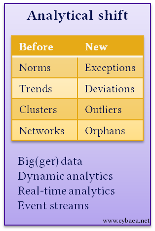 It uses bigger data because we are now analysing raw events, not just summaries. It is dynamic and real-time, and the results are expected in real-time. When I step out from the crowd is also often the right time to communicate.