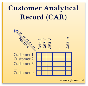To simplify, many organizations introduce the Customer Analytical Record (CAR): a standard set of data, including aggregate data, stored as attributes against each customer over time. Typically there would be at least 24 months data and from a few thousand to ten thousand attributes. We aim that at least 80% of our analysis and reports can be done on this data set. Data may include