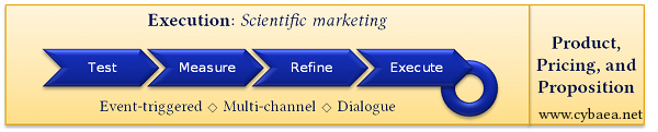 Outside traditional direct marketing we do not forget product, pricing, proposition and go-to-market. We consider them to be execution channels for analytical insights. And like direct marketing we will be able to quantify the effect of our actions (though often with less rigour than then control group validated activities).