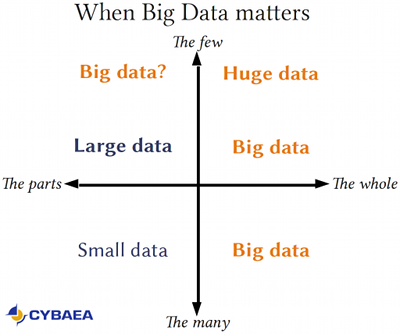 In summary, our rough guide to when Big Data matters look somewhat like the illustration above. When you are looking at the whole (and the whole is a different thing from the parts) you are in big data territory; when you are looking for the few among the many you typically do not need big data techniques though your data may be large; and if you are looking for small signals in the whole, you may be into truly huge data.