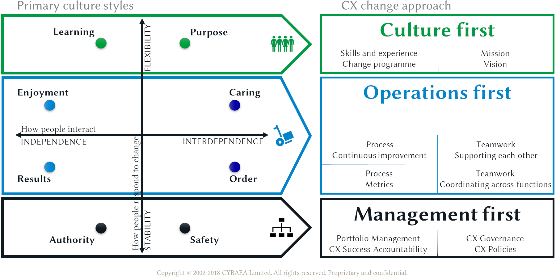 Many organizations will be Results focused with clear lines of P&L responsibility cascading down the organization to rest with individual managers, ie a strong commercial culture of independence and typically a focus on continuous improvements (weak stability) in sales and costs. Inside, the organization will be supportive of employees, valuing team-work (interdependence) and offering (controlled) personal development and career progression (weak flexibility), which helps explain why Caring is the other of the most common culture style in self-reported surveys.