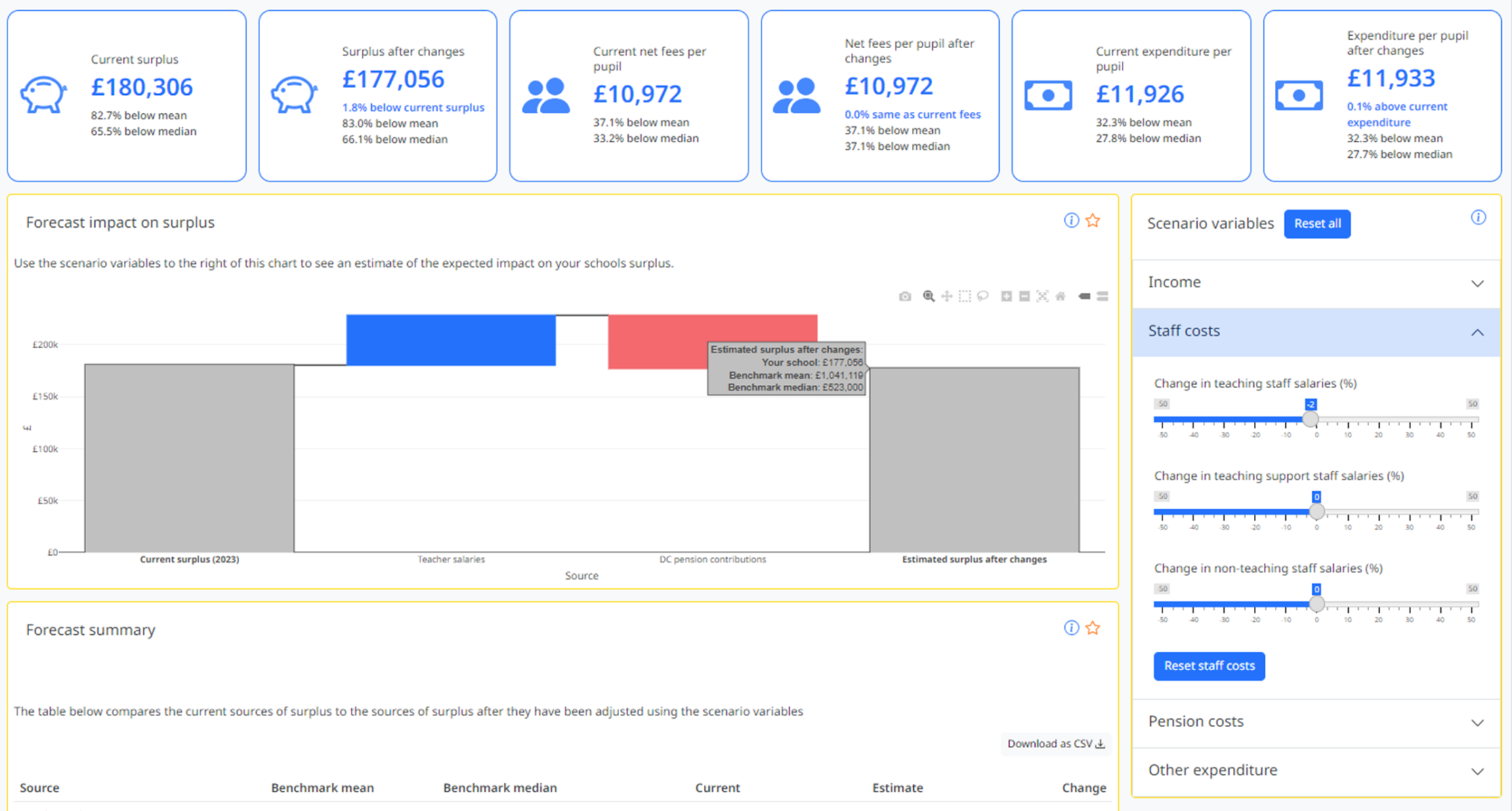 For example, bursars can use the forecasting element of the Data Navigator to view how an increase in pensions costs might affect their overall finances – and more importantly, explore the subsequent impact of different mitigating strategies. The example below shows how the effect of a 13% increase in pension costs requires an offsetting 2% decrease in teacher salaries to remain budget neutral. The result on the school’s overall surplus gives an indication of how these changes might affect its financial performance, both in isolation and compared with the chosen benchmark group.