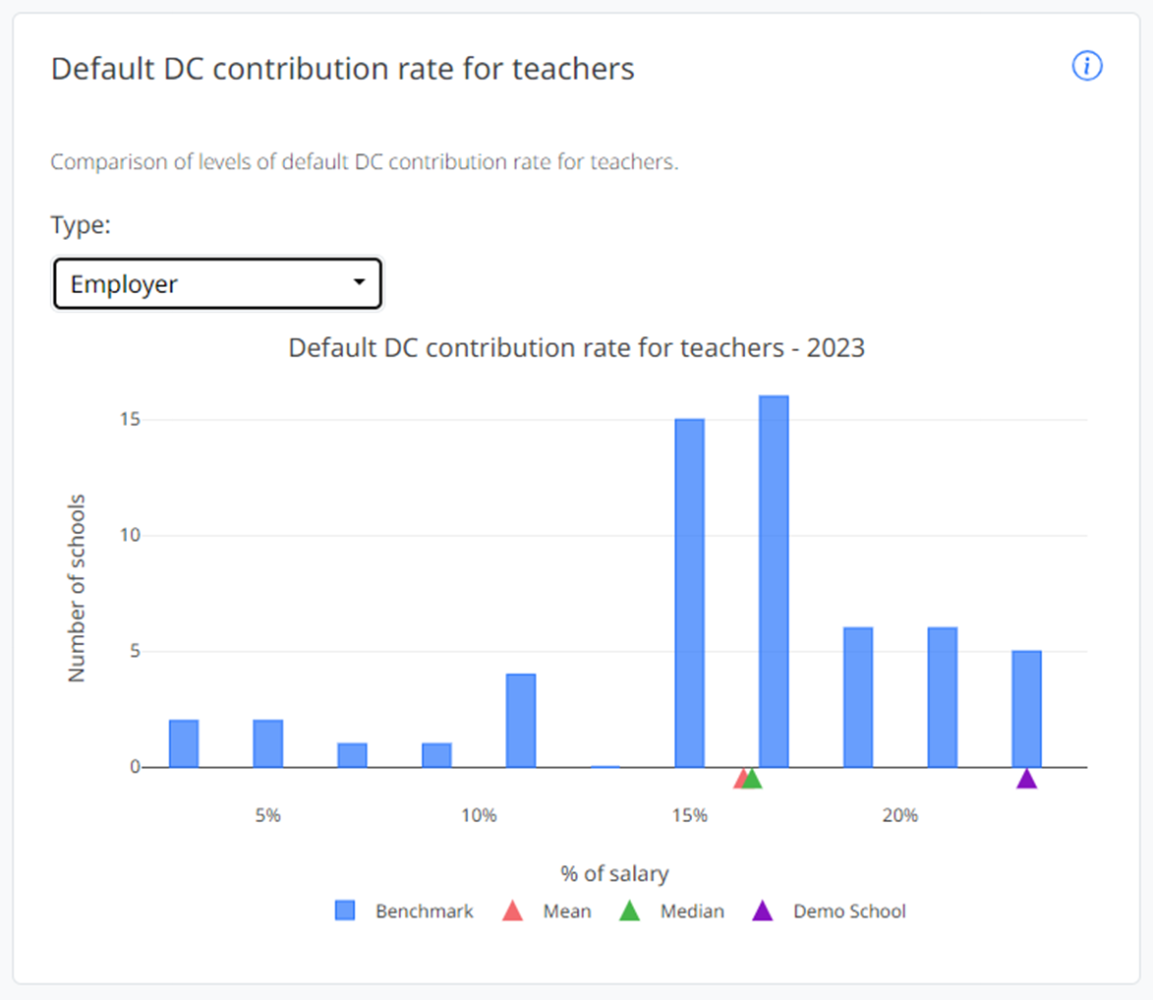 Below you can see the distribution of employer pension contributions for teachers, for schools in the Data Navigator. The average rate (indicated by the red triangle) is 16%, which has been shown to be representative of the sector. A bursar seeing this could choose to compare themselves to a subset of these schools and use that to drive strategic decision-making. In the example below, the Demo School has an above average contribution rate and can conclude they might be relatively more impacted than their peers if NI were introduced on these contributions.